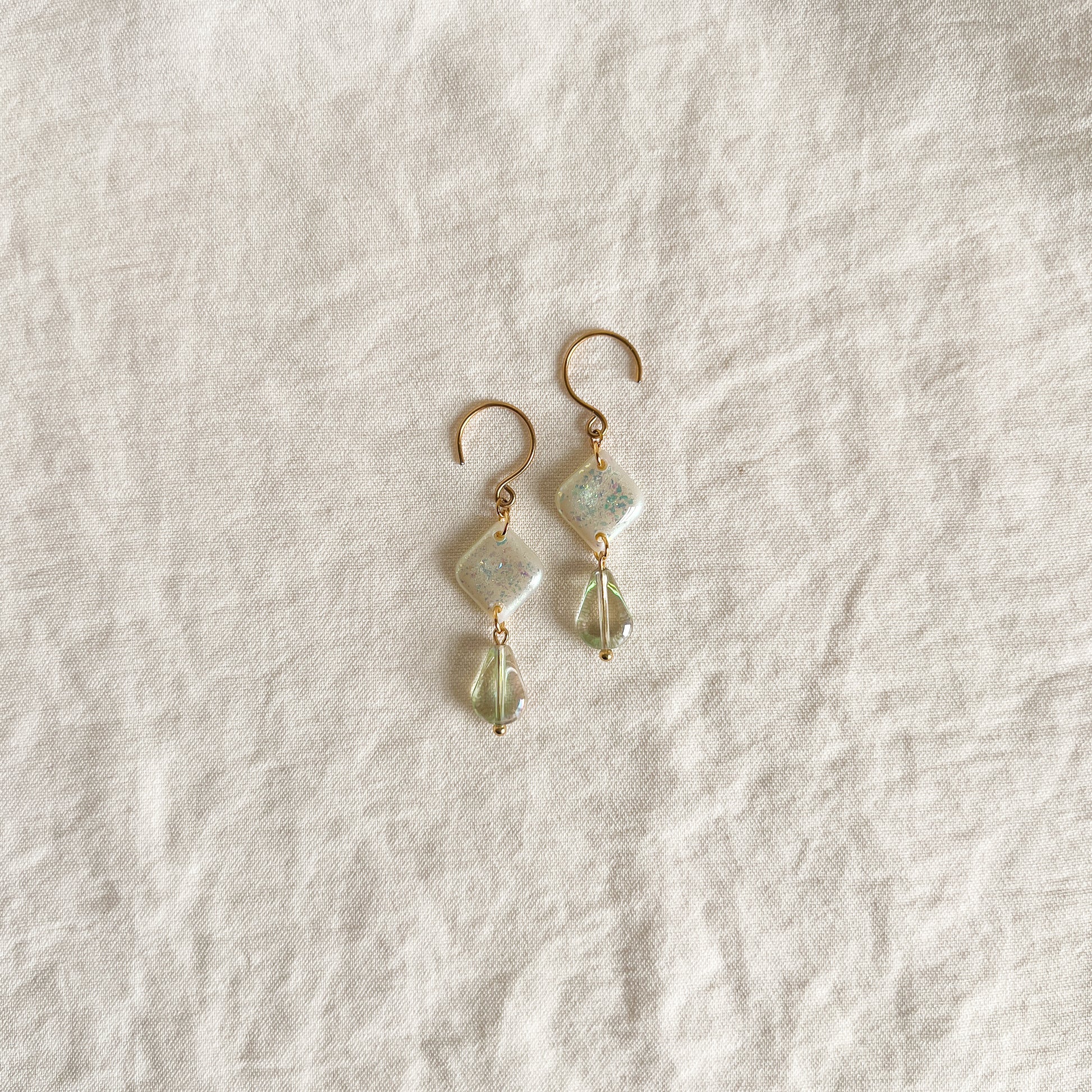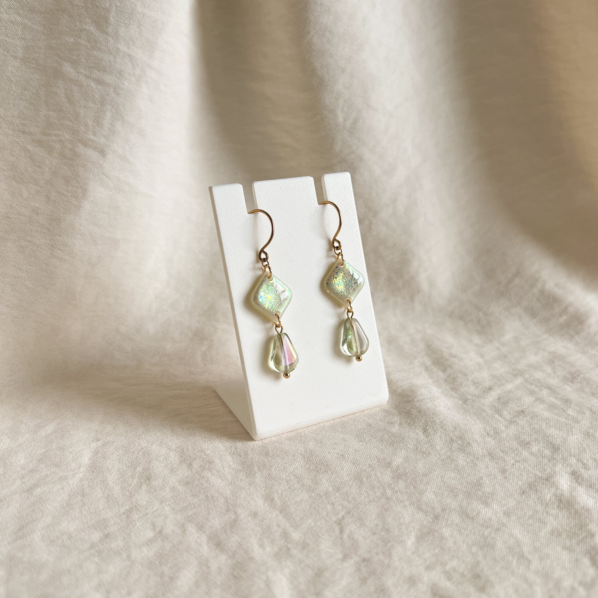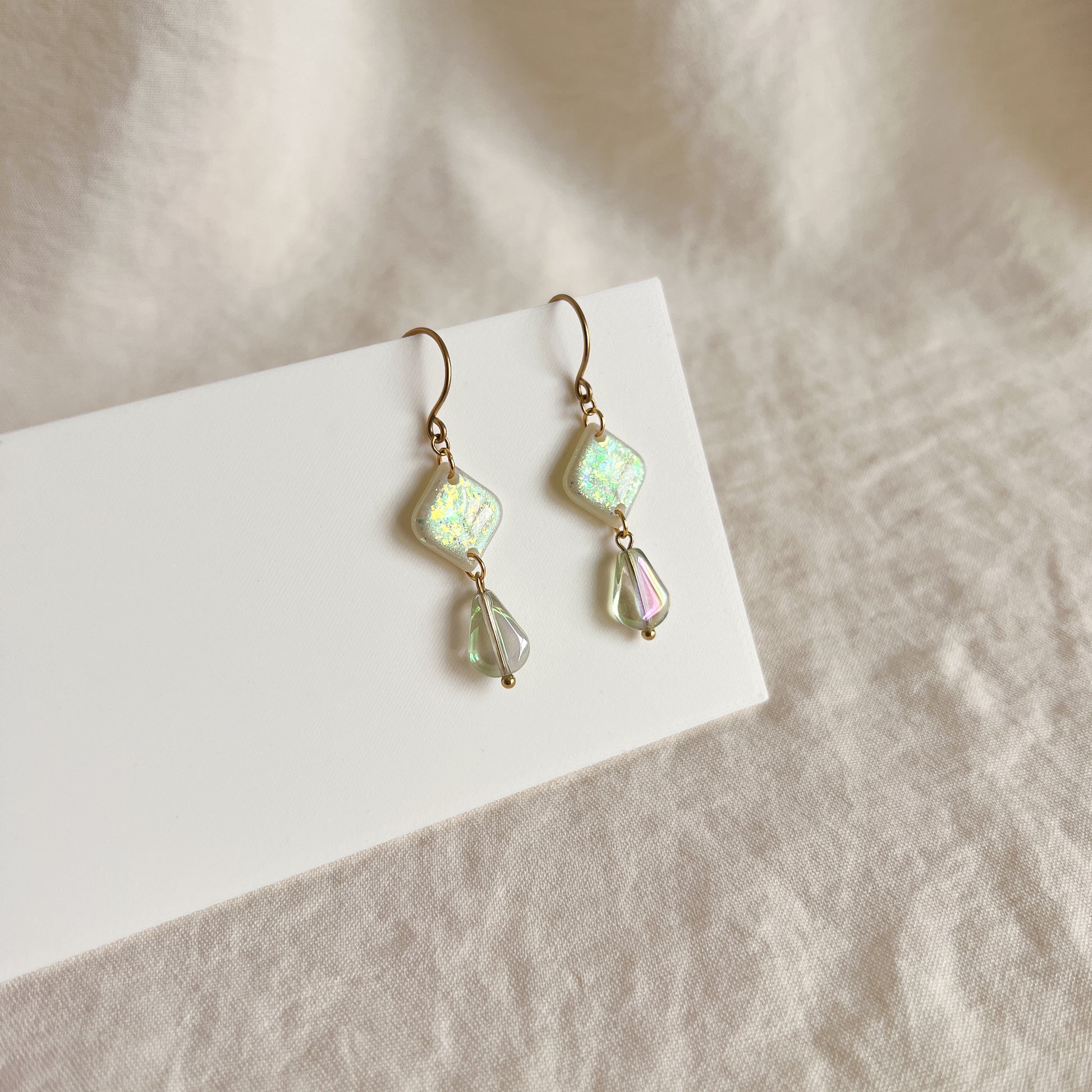 Materials: Polymer clay, stainless steel components, opal flakes, glass beads, resin